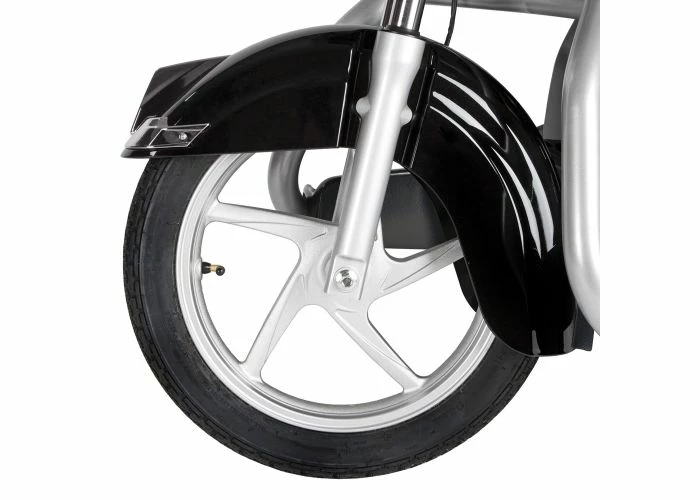 The Maverick is Drive’s largest luxury scooter, and this big pneumatic wheel assembly looks as if it belongs on a steeet-legal motor scooter or even a motorcycle