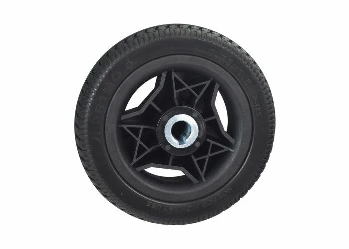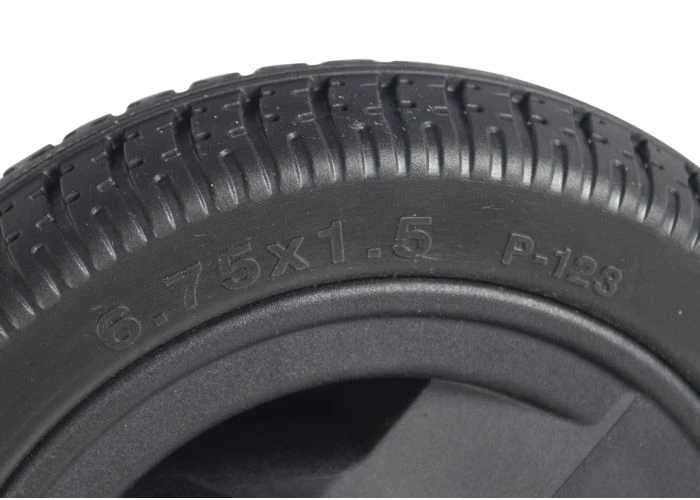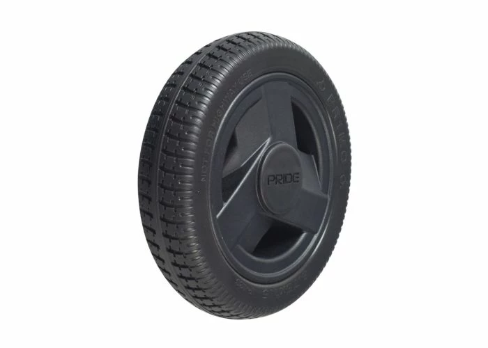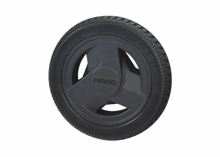 The 6-3/4″ rear wheel assembly for the Pride Mobility iRide (S25) scooter features a black flat-free solid tire on a black 3-spoke rim