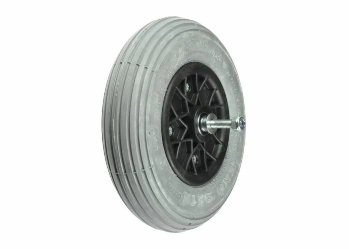 This front wheel assembly measures 8″x2″, otherwise known as a 200×50 wheel.