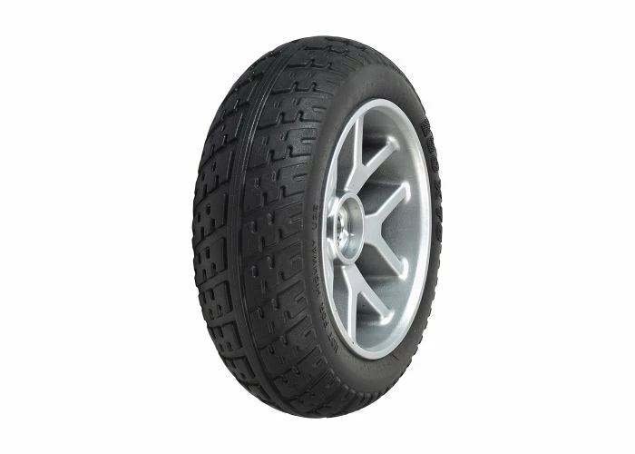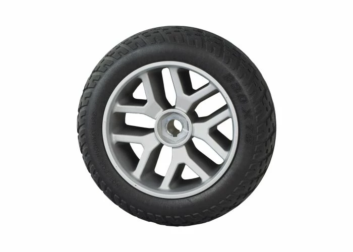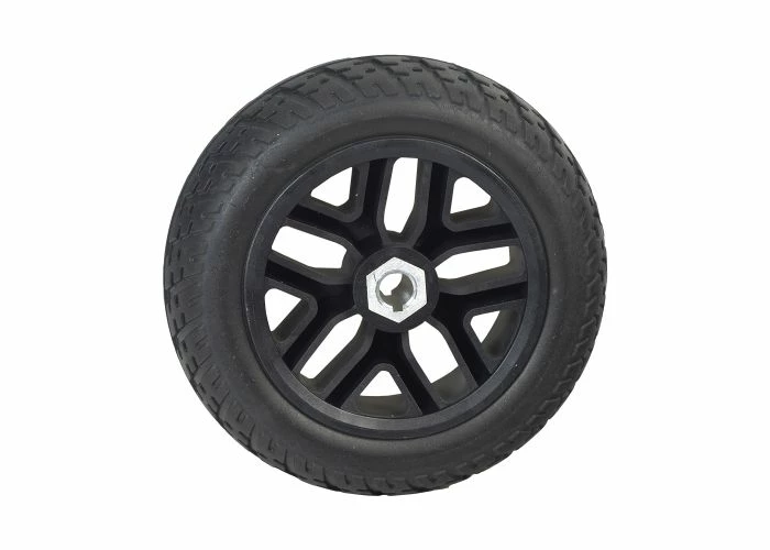 The 9″ rear wheel assembly for the Golden Buzzaround EX (GB118 & GB148) and Buzzaround LX (GB119/GB149) scooters, also known as the drive wheel, comes with a flat-free black tire pre-mounted to the rim