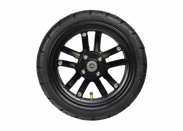 We send you the whole assembly, and it comes complete with that big low-profile tire, the inner tube, 10″ rim, and bearings.
