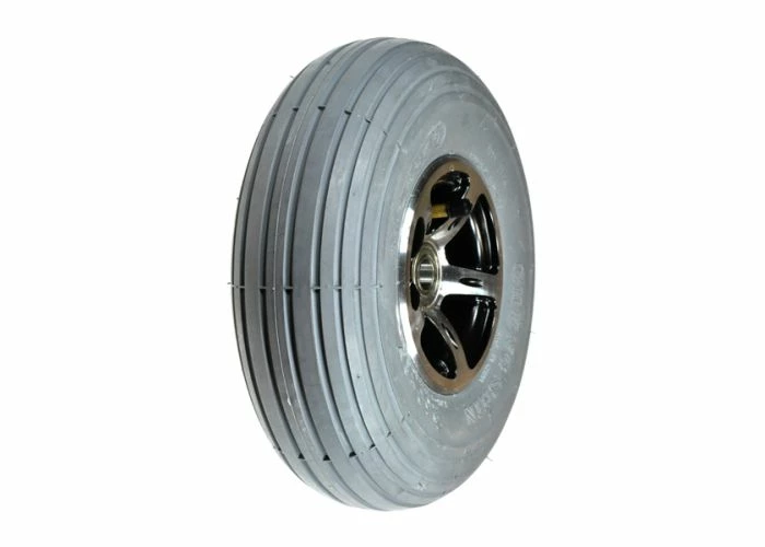Our smooth-riding 3.00-4 pneumatic front wheel assembly for the Merits Pioneer 4 (S141/S1412/S1413) mobility scooter features a stylish black and polished metal hub.