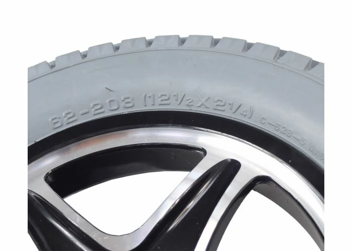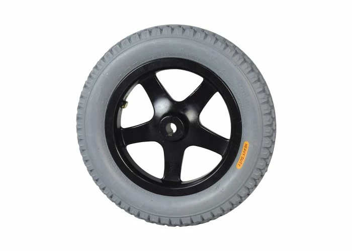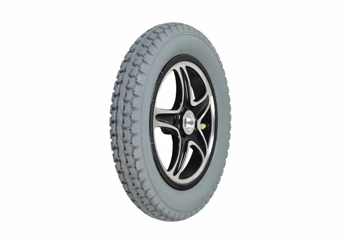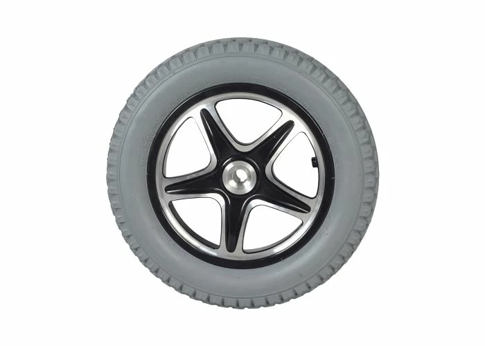 Here is the standard 12-1/2″ foam filled drive wheel assembly for the Merits Travel Ease Commuter Series folding power chairs