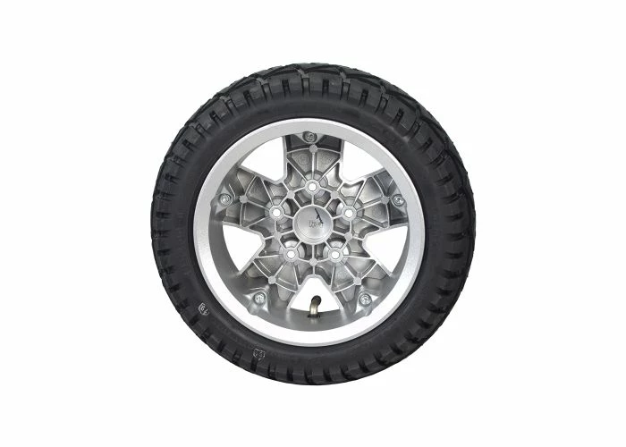 This 13×4.00-8 (13″ tire) low profile pneumatic wheel assembly for the Pride Pursuit, Pursuit Sport, and Victory XL mobility scooters may be used on either the front or the rear
