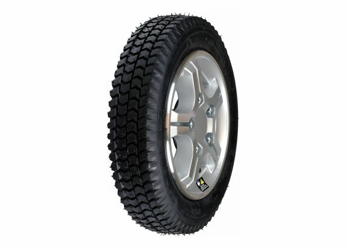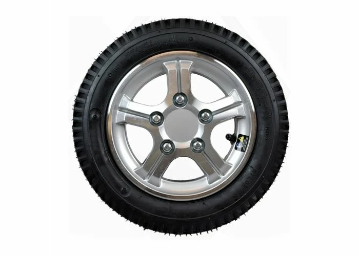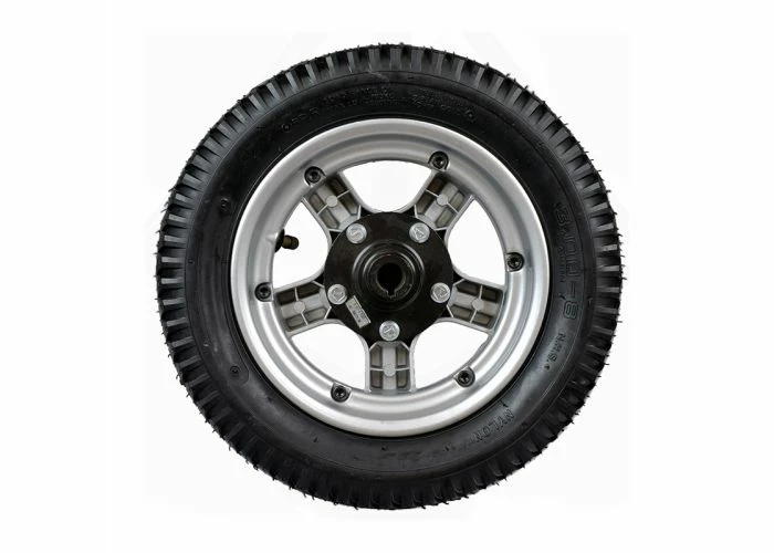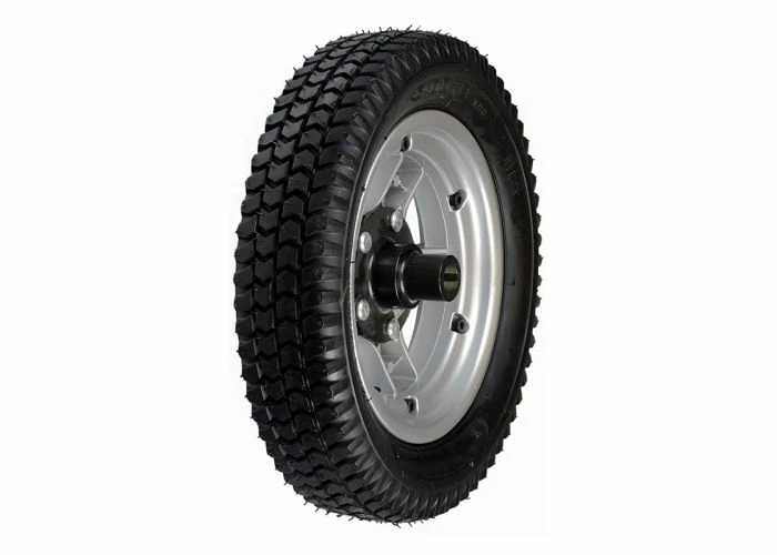 The 14 X 3″ (3.00-8) pneumatic rear wheel assembly for the Pride Pursuit XL (SC714) mobility scooter comes complete with the inner tube, a black 14 X 3″ (3.00-8) tire, and a sharp-looking silver rim
