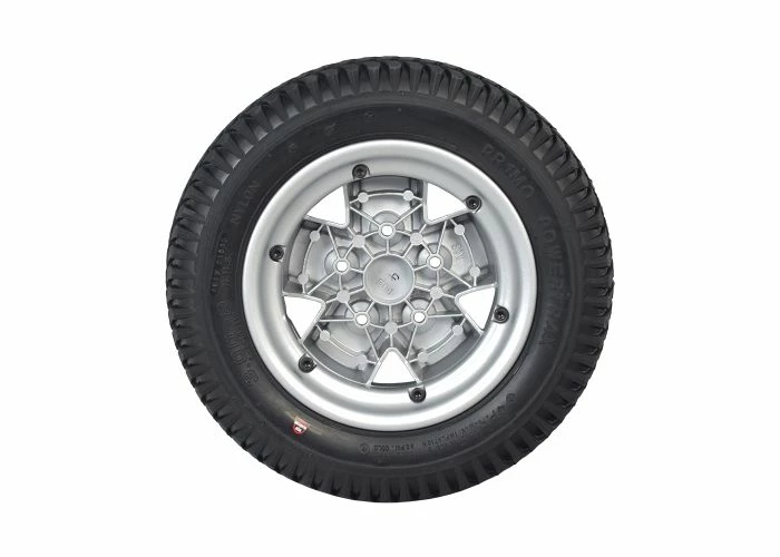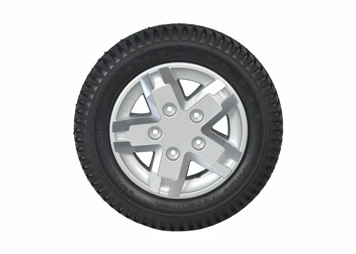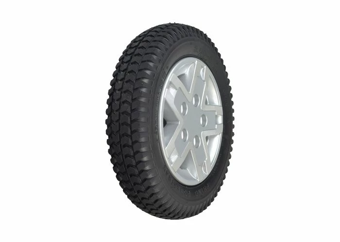 The 14″x3″ Run Flat drive wheel for the Jazzy 600 ES power chair features a 5-spike silver finished hub, and a black tire with the Run Flat, anti-flat composition