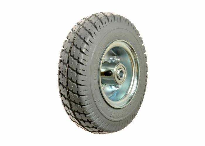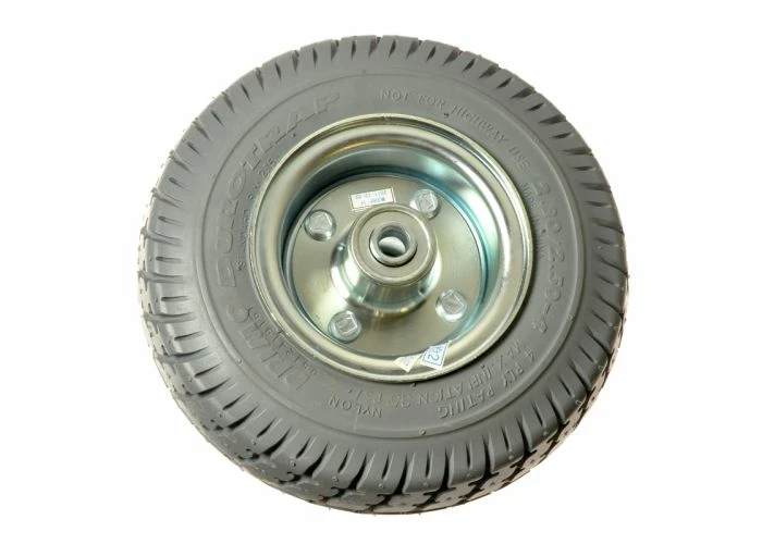 This flat free front wheel assembly for the PaceSaver Plus III, Plus III Atlas, and Plus III Titan mobility scooters offers dependable service. The PaceSaver Plus III series scooters were offered with the customers’ choice of either 9″ or 10″ wheels. this 9″ front wheel assembly has a tire with the Primo Durotrap tread design that is as good outdoors as it is in the shopping mall.