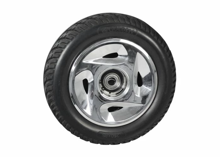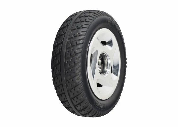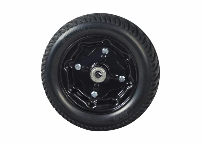 The 10″ solid black front wheel assembly for the Golden Technologies Companion II (GC440) 4-wheel mobility scooter offers a flat-free, worry-free ride