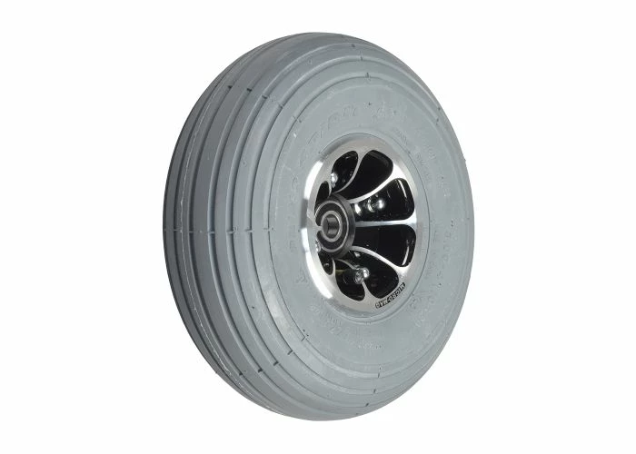 Pride’s exclusive wheel assembly includes 3.5×10 pneumatic tire with gray non-marking rubber, stylish black micro mag rim, spacer, washers, nuts, and bearings.