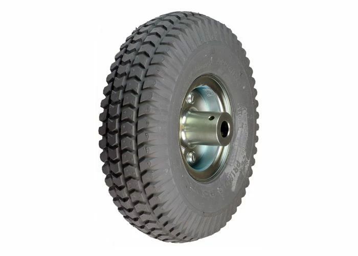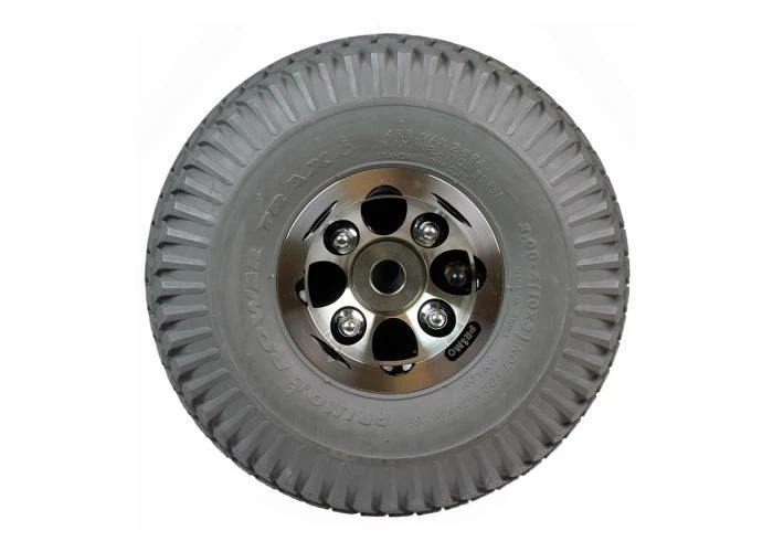This 10″ wheel assembly includes the rim, inner tube, and a 3.00-4 pneumatic Primo Powertrax tire