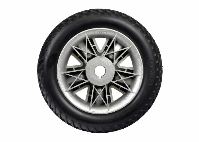 This 8″ x 2″ flat-free rear wheel assembly with black tire for the ActiveCare Spitfire 1310 & 1410 mobility scooters is for those later scooter models that used the black tires
