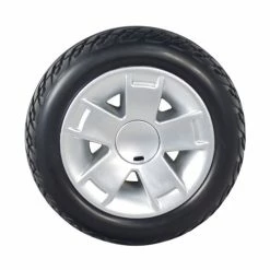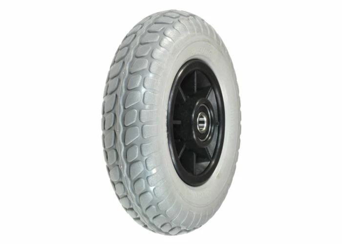 Front wheel assembly for the Shoprider Cooper, Dasher 3, Hero and Shoprider Scootie Jr mobility scooters includes molded polyurethane tire and 6201RS wheel bearings