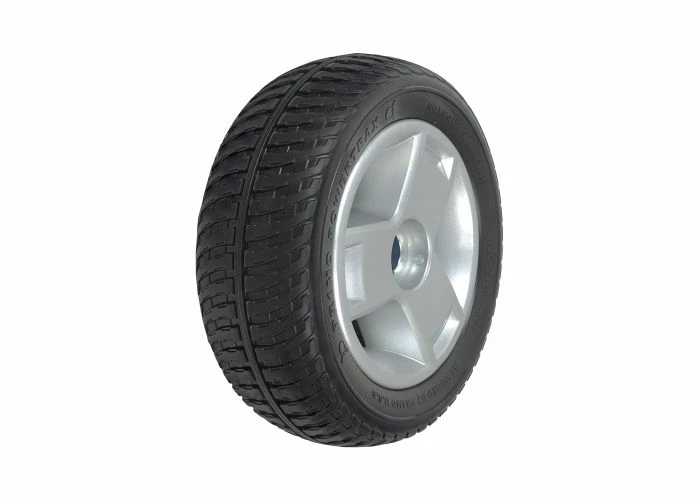 This complete wheel assembly includes a 8” X 2.50” flat-free black tire, and stylish silver tri-spoke rim.