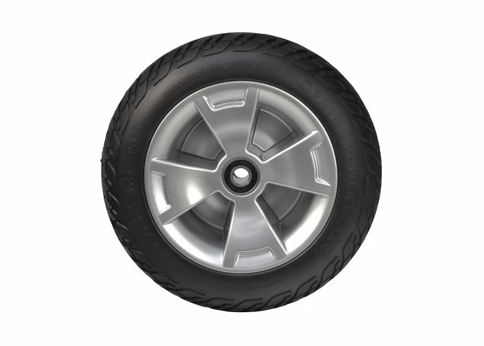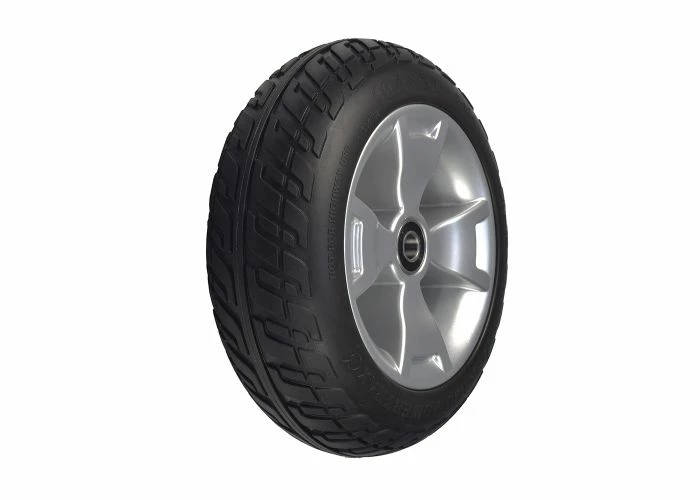 The black foam-filled front wheel assembly for the 3-wheel Pride Celebrity X (SC4001) or Mega Motion Endeavor X (MM4001DX) comes complete with a low profile black tire, a shiny silver rim, spacer, and a pair of 6202-2RS wheel bearings