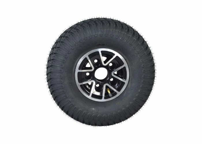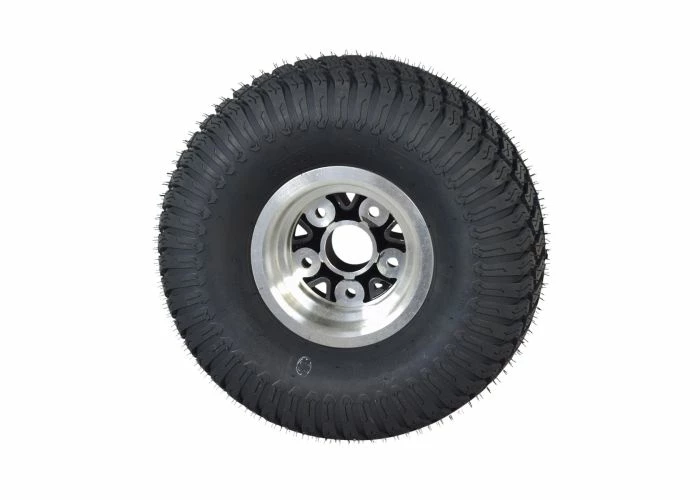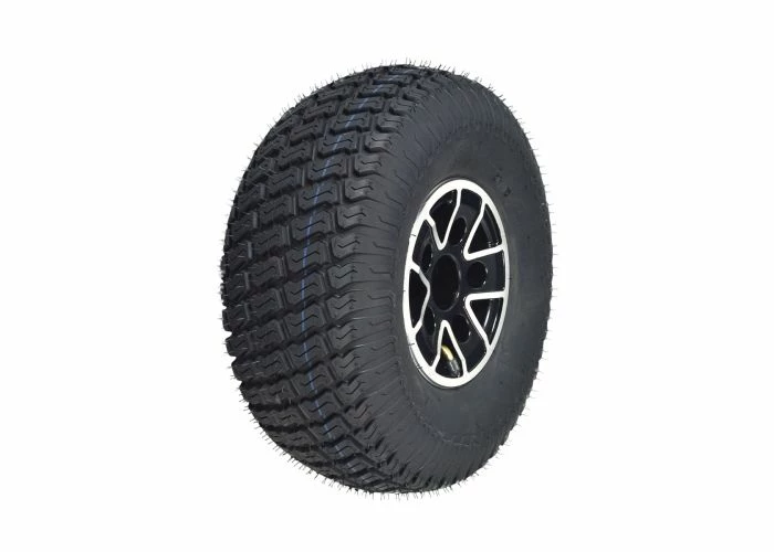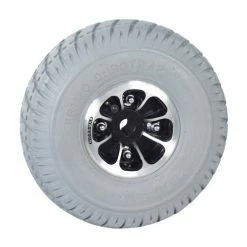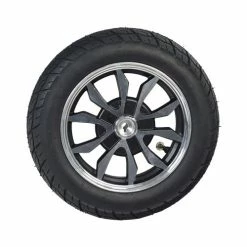 The 14.5″ front or rear pneumatic wheel assembly for Pride Wrangler (MV600) and Baja Wrangler 2 (BA400) mobility scooters features a tubeless pneumatic tire on its black and silver rim
