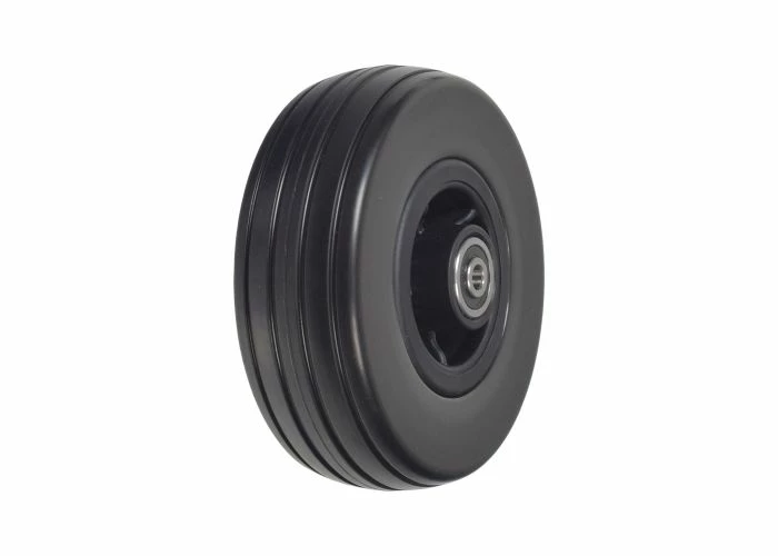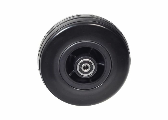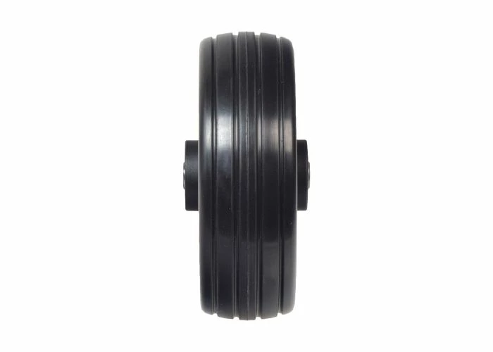 The solid flat-free tire uses a nice ribbed tread suitable for indoors or out on the pavement