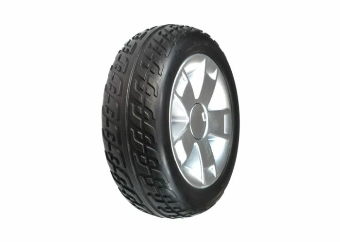 The wheel assembly features a black tire filled with PU foam mounted onto a 5-spoke silver-colored rim.