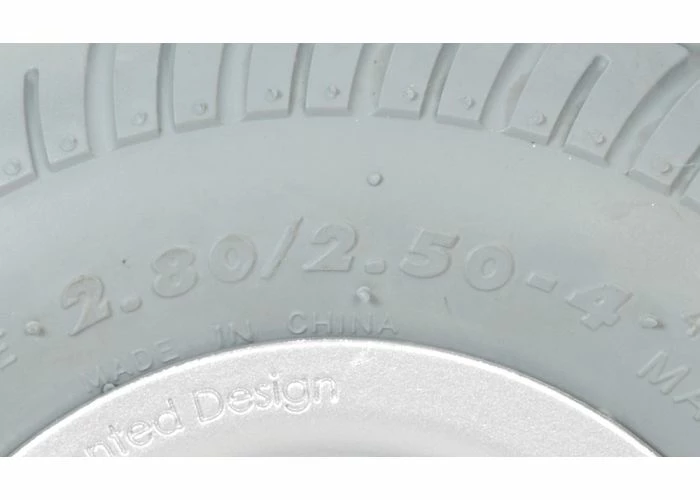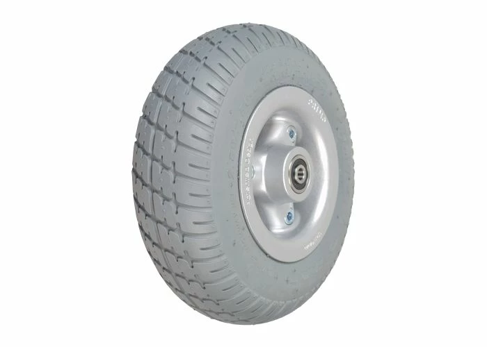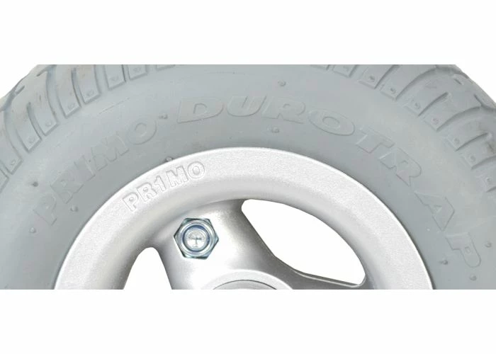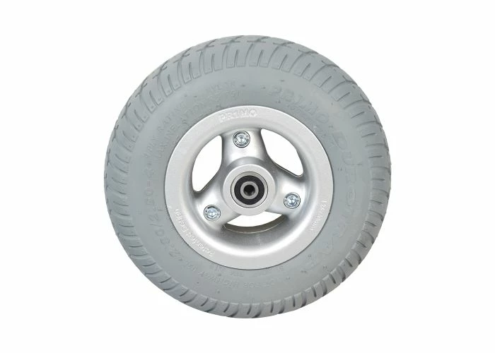 The 9″ flat-free caster wheel for the Quantum Rival power chair features a gray tire mounted onto a silver rim