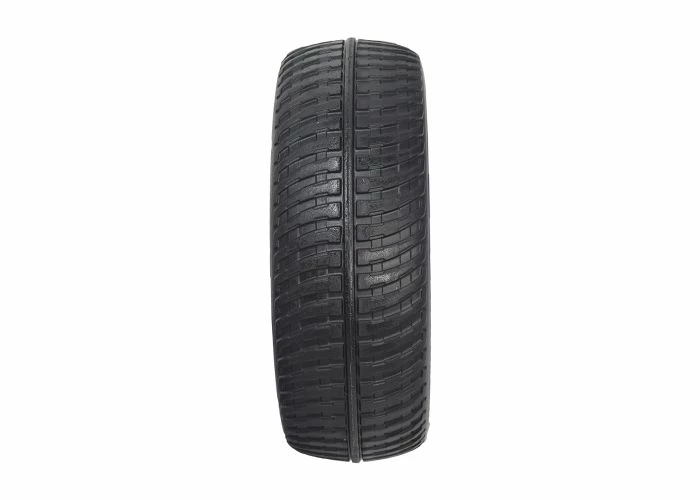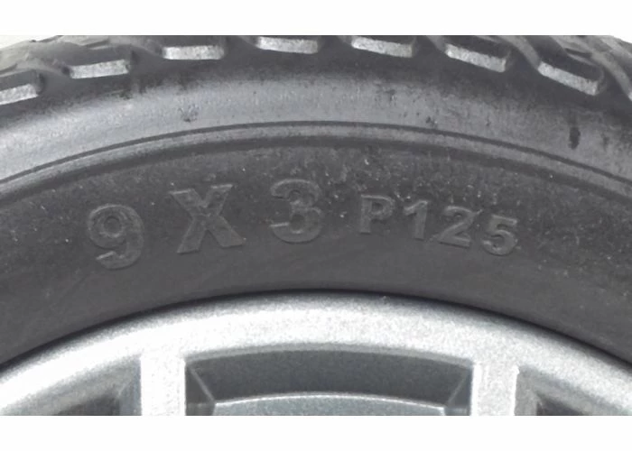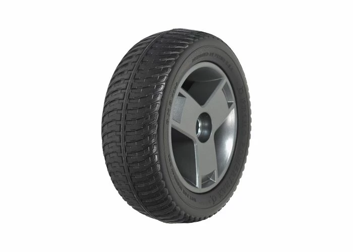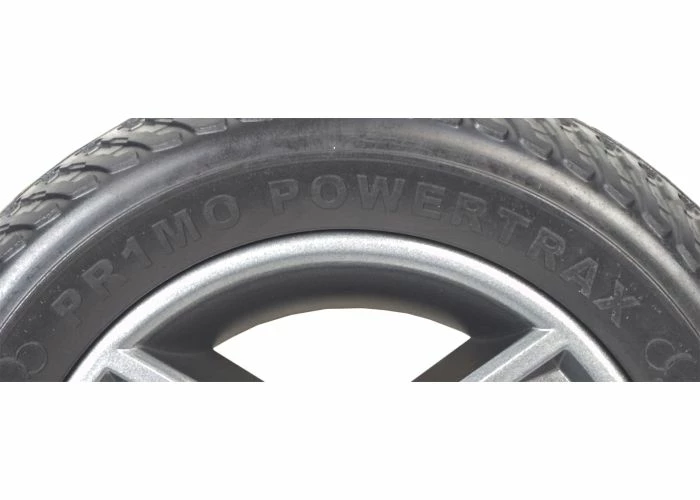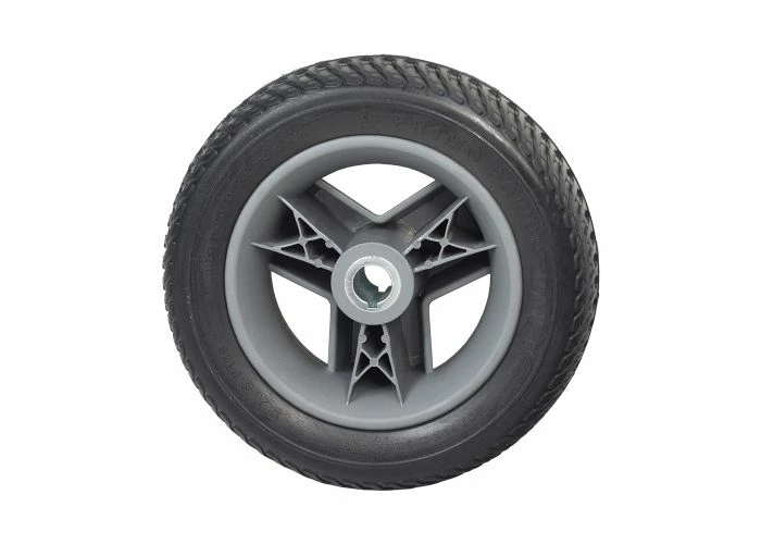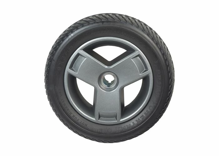 The 9″ foam-filled drive wheel assembly for the Go-Go Go Chair features a black PU foam-filled tire on a Tri-spoke Euro Gray rim