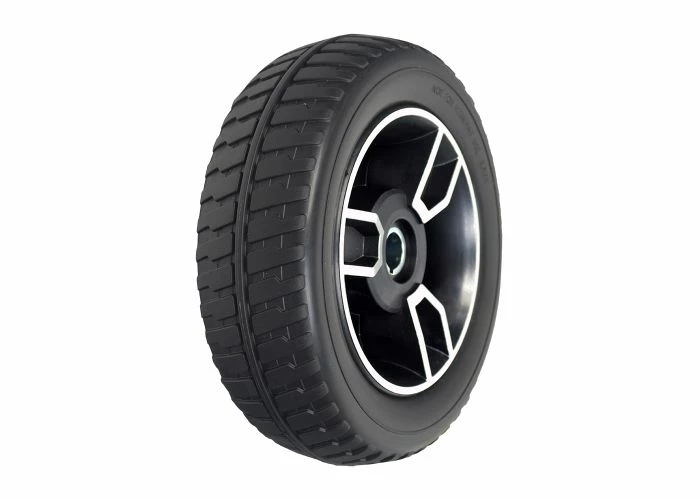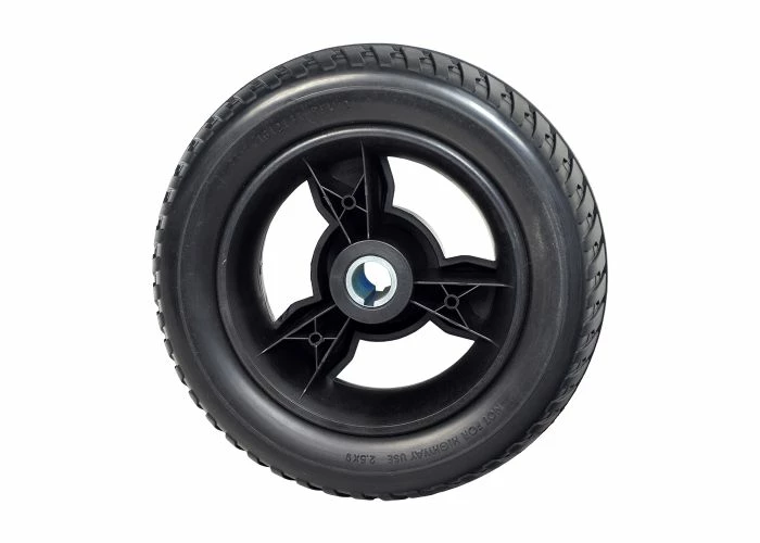 This rear wheel sports a non-marking black 9″x3″ flat-free tire